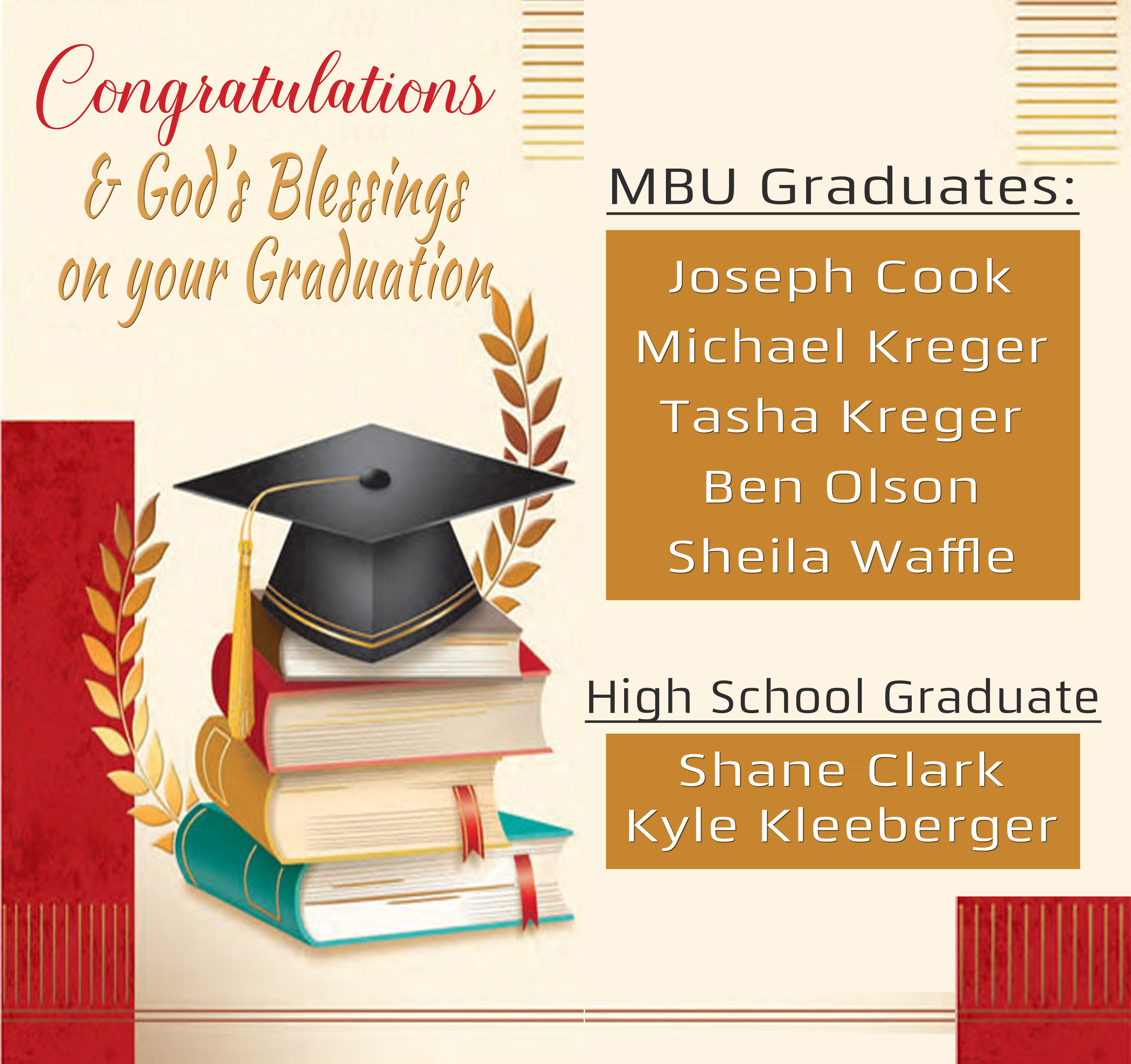Sunday May 3 - Graduation Sunday. We will have lunch and a 1:00pm afternoon service