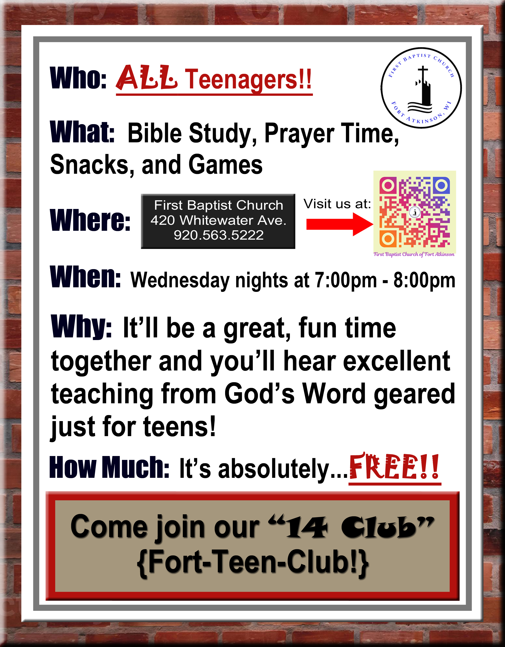 • Who: All Teenagers • What: Bible Study, Prayer Time, Snacks, and Games • When: Wednesday nights at 7:00pm - 8:00pm • Where: First Baptist Church • How Much: It's absolutely...Free!!