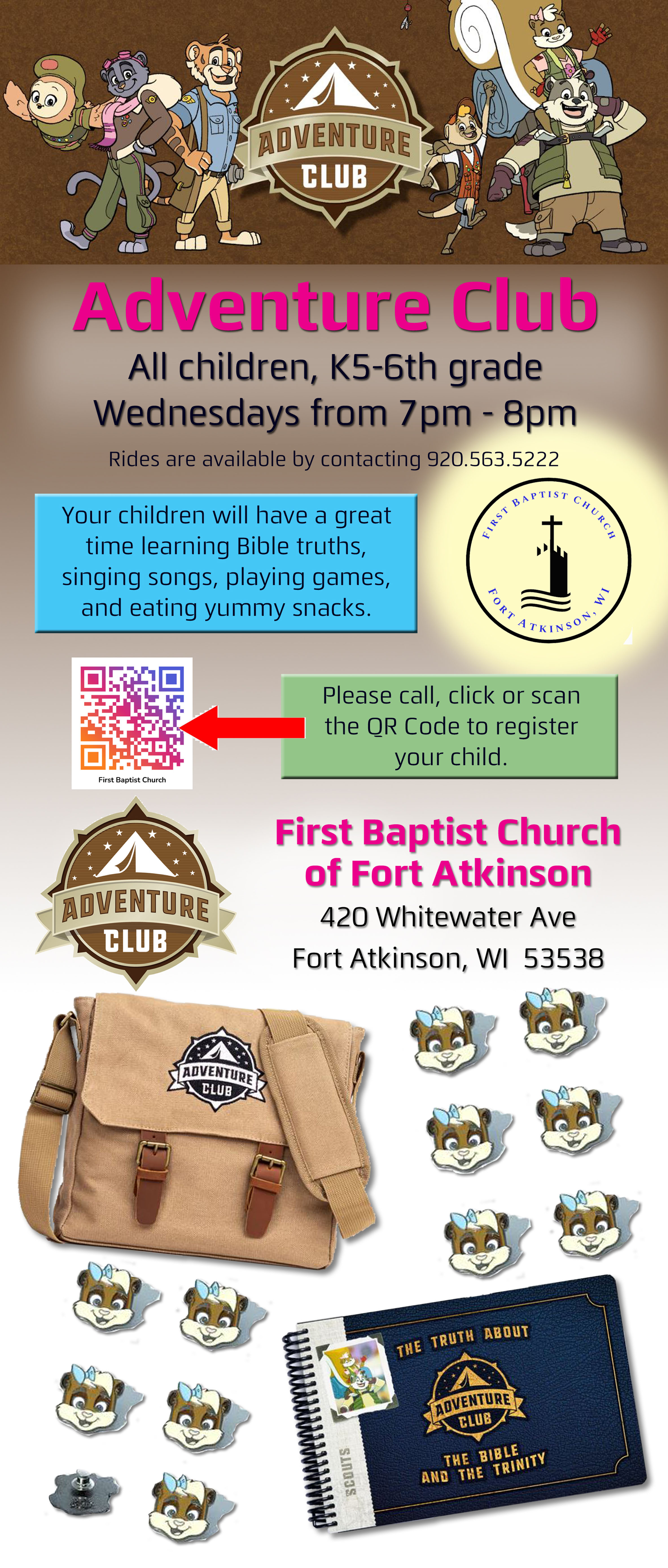 Adventure Club meets Wednesday's 7:00pm - 8:00pm at the church.