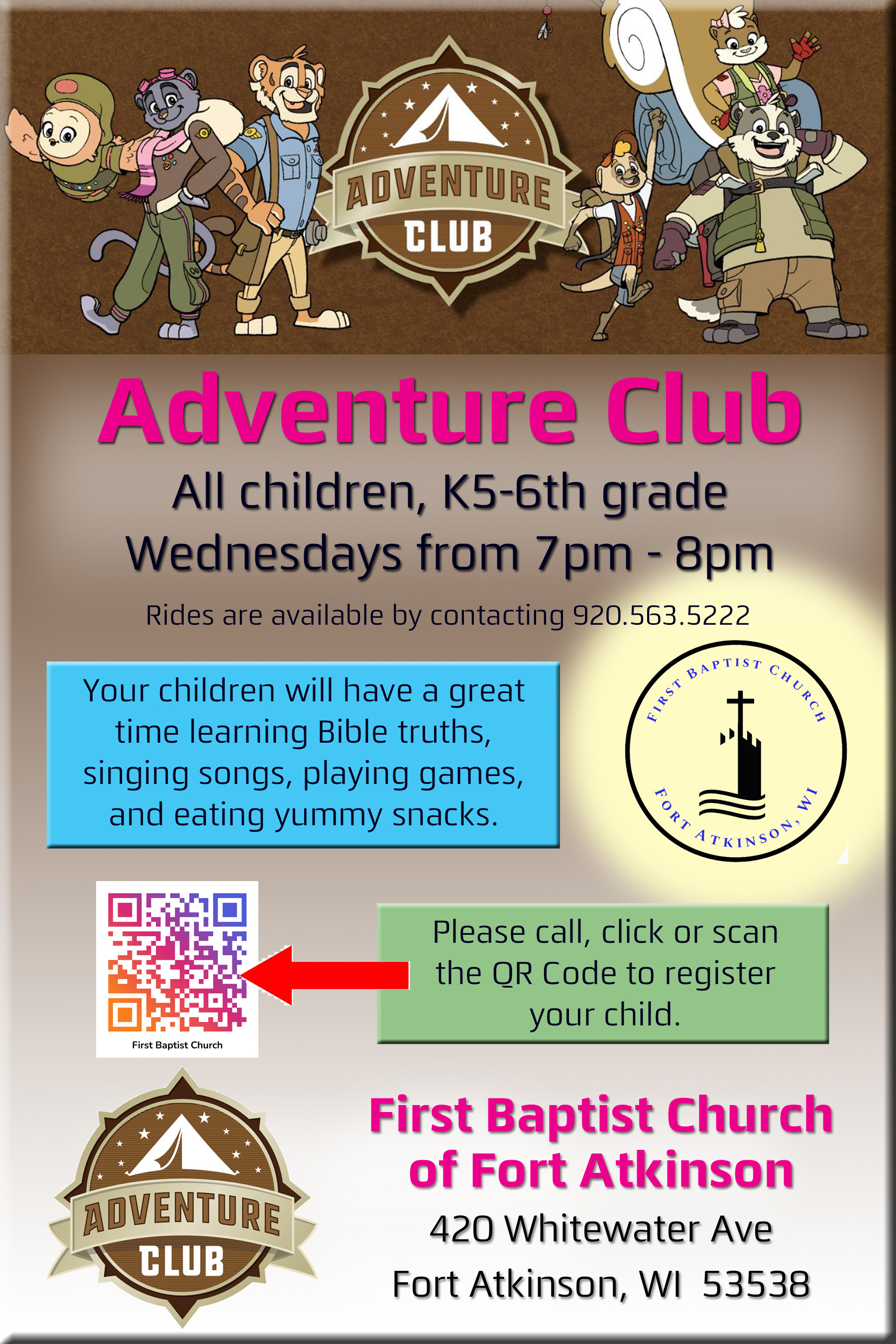 For all children, K5-6th grade. We have fun studying and learning Biblical truths about the gospel.